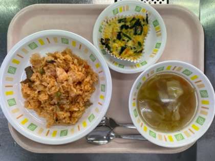今日の給食は、チキンライス、キッシュ、キャベツスープ、牛乳です。