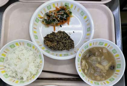 ごはん、魚のごまフライ、野菜の和風ドレッシング、みそ汁、牛乳です。