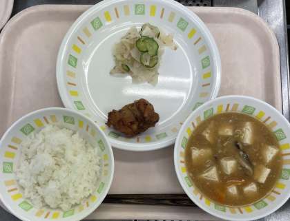 ごはん、いかのかりんと揚げ、大根ときゅうりのごま風味、麻婆汁、牛乳です。
