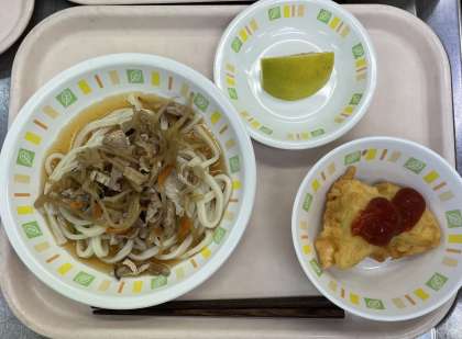五目冷やしつけうどん、ポテトドッグ、くだもの、牛乳です。