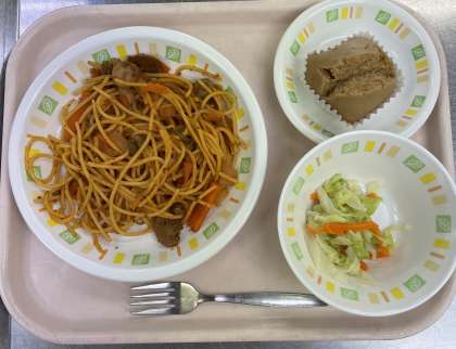 スパゲッティナポリタン、コールスローサラダ、黒砂糖蒸しパン、牛乳です。