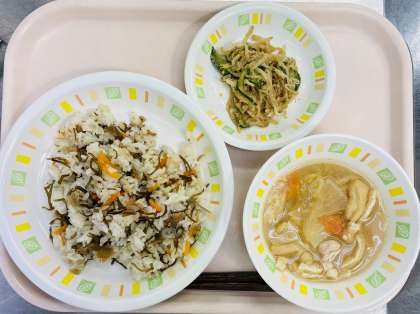 豚肉とごぼうのごはん、ごま酢かけ、呉汁、牛乳です。