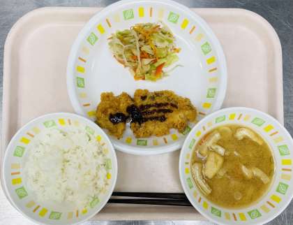 ごはん、魚のフライ、キャベツのおかかかけ、みそ汁、牛乳です。