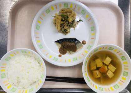 ごはん、魚のピリ辛ソースかけ、カリカリ油揚げと野菜のひたし、清汁、牛乳です。