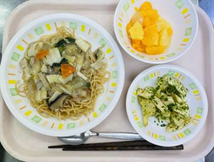 五目あんかけそば、フライドポテト、フルーツカクテル、牛乳です。