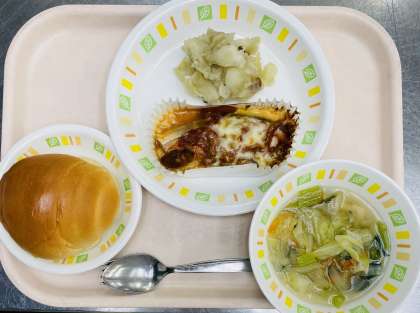 バターロールパン、魚のピザ風、ジャーマンポテト、キャベツのスープ、牛乳です。