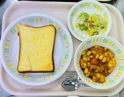 フレンチトースト、ポークビーンズ、野菜のドレッシングかけ、牛乳です。