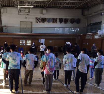 桜町小学校の体育館に、尾山台小学校、奥沢小学校の特別支援学級の子どもたちが集い、四校交流会を行いました(八幡中学校はオンライン参加)。