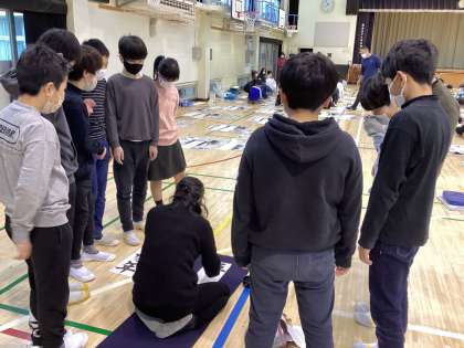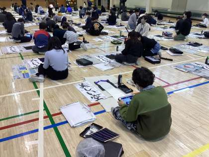 1、2時間目に体育館にて書き初め会がありました。書道家の燦月先生のお手本の様子をしっかり見ています。