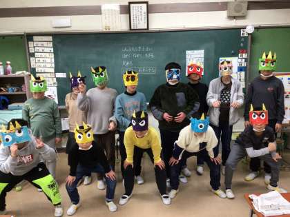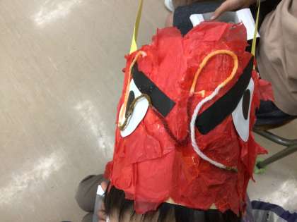 生活単元学習の一環で、季節の行事「節分」を楽しみました。図工の授業で作った鬼の面をつけて、レクリエーションを楽しみました。最後は、自分の心にいる「追い出したいオニ」をイメージし、「鬼は外!」と元気に豆まきをしました。今年も1年、元気に過ごせますように!