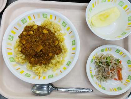チリビーンズライス、もやしとツナのサラダ、くだもの、牛乳です。