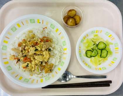 親子丼、野菜のひとしお、白玉団子(みたらし)、牛乳です。