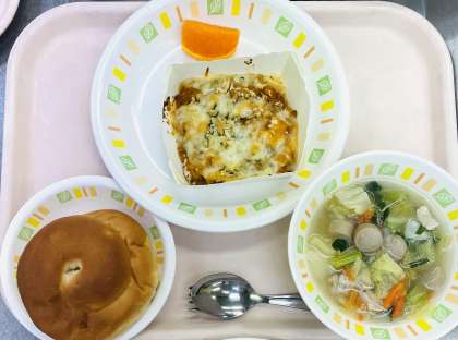パインパン、豆腐のグラタン、ウィンナーと野菜のスープ、くだもの、牛乳です。