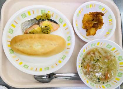 ソフトフランスパン、魚のガーリック焼き、じゃがいものケチャップ和え、野菜スープ、牛乳です。