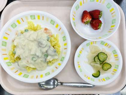 ドリア風、大根ときゅうりのごま風味、くだもの、牛乳です。