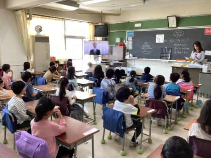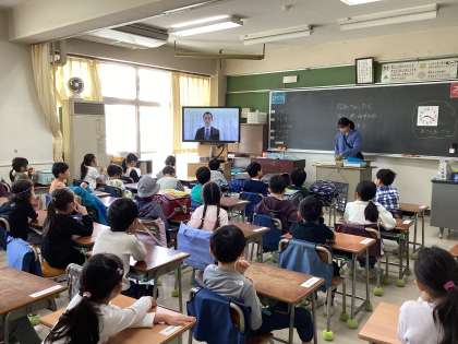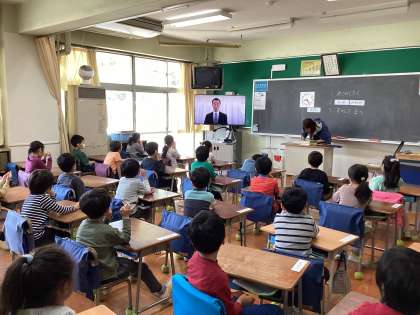 今年度1回目の全校朝会です。全校朝会はオンラインでテレビ放送です。写真は1年生の様子です。