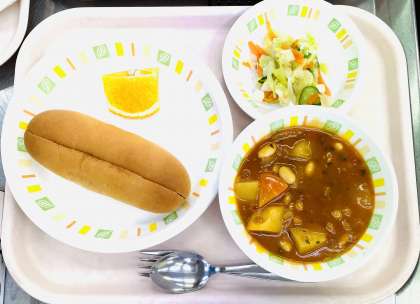 レーズンバターサンド、牛乳、ビーンズシチュー、チーズ入りサラダ、くだものです。