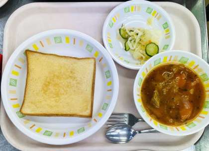ハニートースト、牛乳、ボルシチ、野菜のイタリアンドレッシングかけです。