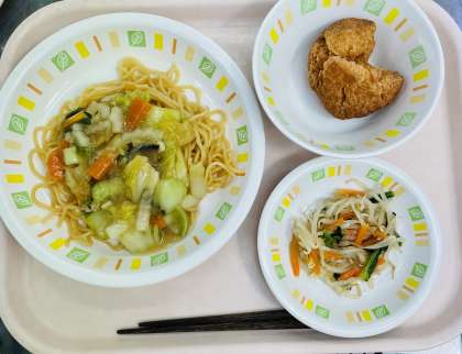 五目あんかけそば、牛乳、塩ナムル、サーターアンダギーです。