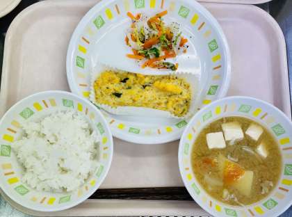 ごはん、牛乳、千草焼き、白菜と人参のゆかりかけ、豚汁です。