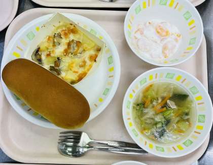 あしたばパン、牛乳、ポテトグラタン、野菜スープ、みかんヨーグルトです。