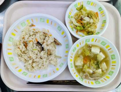 生姜たっぷり炊き込みおこわ、牛乳、はりはり茹で野菜、豆腐汁です。