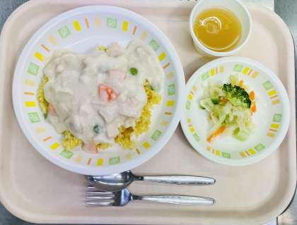 ドリア風、牛乳、茹で野菜のドレッシングかけ、りんごゼリーです。