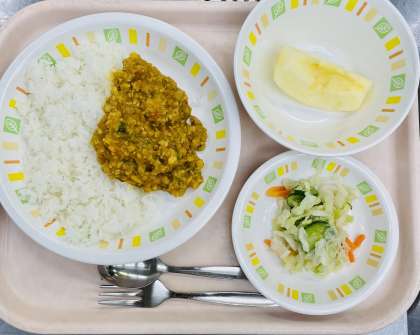 キーマカレーライス、牛乳、フレンチサラダ、くだものです。