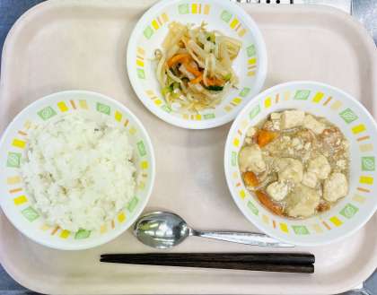 ごはん、牛乳、豆腐の五目炒め、こんにゃくサラダです。