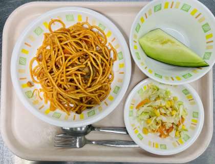 スパゲッティナポリタン、牛乳、コーンサラダ、くだものです。