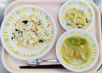 青菜とじゃこのチャーハン、牛乳、バンサンスー、レタススープです。