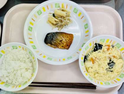 ごはん、牛乳、さばの一味焼き、カリカリ油揚げと野菜のひたし、かきたま汁です。