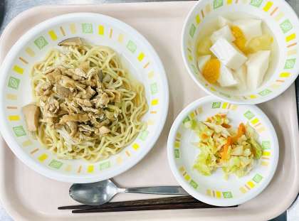 冷やし中華、牛乳、中華サラダ、杏仁豆腐です。