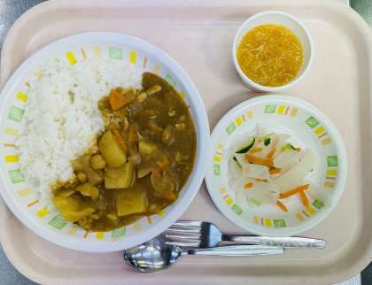 ひよこ豆のカレーライス、牛乳、ピクルス、みかんゼリーです。