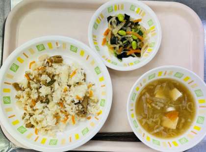 子ぎつねごはん、牛乳、枝豆入り大根とわかめのサラダ、みそ汁です。