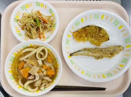 煮込みうどん、牛乳、ししゃものごまからあげ、かぼちゃ天ぷら、野菜のからしじょうゆかけです。