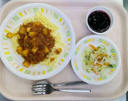 チリビーンズライス、牛乳、ゆで野菜のドレッシングかけ、ぶどうゼリーです。