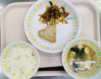 ごはん、牛乳、魚の西京焼き、刻み昆布の五目煮、吉野汁です。