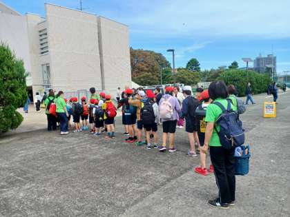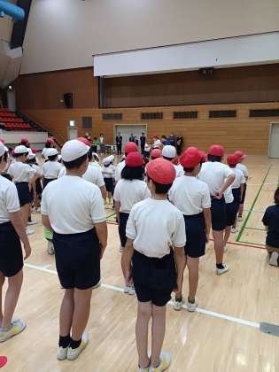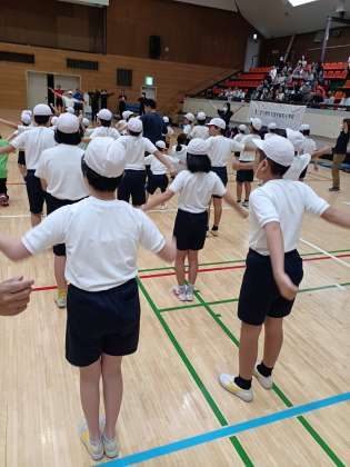 世田谷区立総合運動場の体育館にて連合運動会が行われました。会場に到着したところと開会の様子です。