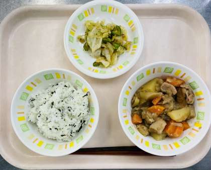 わかめごはん、牛乳、五目うま煮、キャベツのおかかかけです。