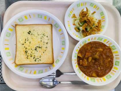 ガーリックトースト、牛乳、トマトシチュー、パリパリサラダです。