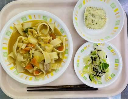 ほうとう、牛乳、キャベツの塩こんぶかけ、小松菜蒸しパンです。