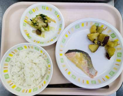 ごはん、牛乳、魚のみそマヨネーズ焼き、さつまいもの甘辛煮、きのこ入りおひたしです。