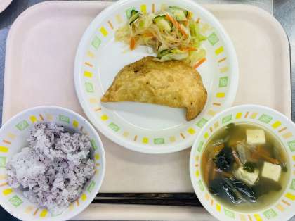 ゆかりごはん、牛乳、ジャンボぎょうざ、春雨サラダ、わかめスープです。