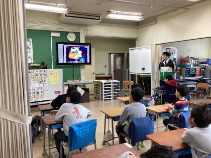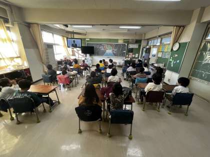 3学期の始業式の様子です。校長先生のお話で、大谷選手のグローブが学校代表の運動委員長に渡さ、キャッチボールの様子が放送されました。