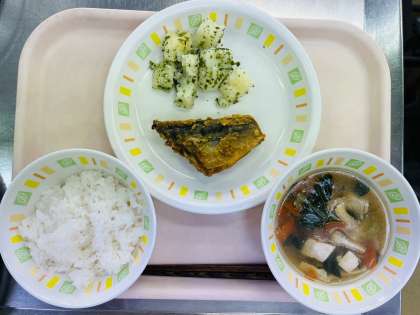 今日の給食は、 有機米、牛乳、魚のカレー揚げ、粉ふきいも、吉野汁です。