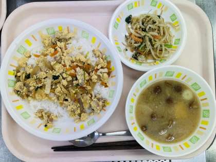 今日の給食は、 親子丼、牛乳、野菜のごまだれかけ、なめこみそ汁です。