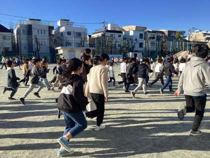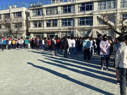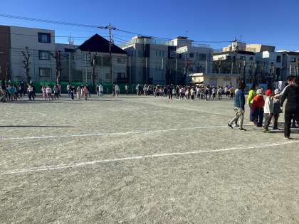 本日の体育朝会はエンジョイランニングです。エンジョイランニングは1/15から2/10まで、体育の授業の中で行われます。