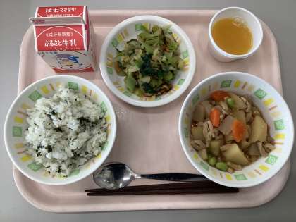 わかめごはん、牛乳、肉じゃが、キャベツと小松菜ののりあえ、みかんゼリー