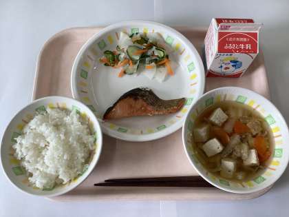 今日の給食は、ごはん、牛乳、魚の塩焼き、野菜の甘酢かけ、豆腐汁です。